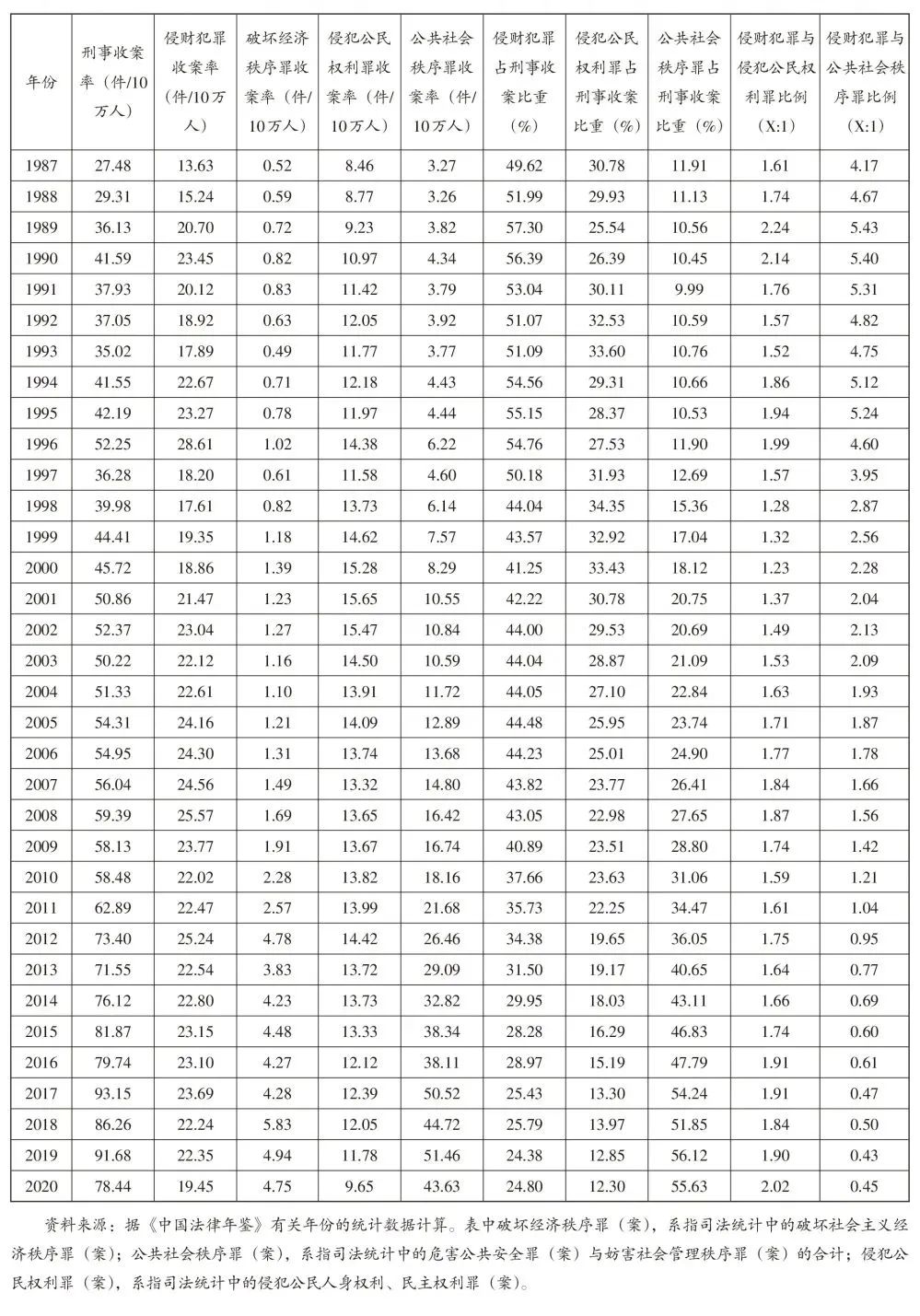 公安机关统计的盗窃及诈骗案(财产犯罪)与杀人、伤害及强奸案(暴力性犯罪)的比例,呈现大幅增长的态势。由1986年的6.38增至2020年的29.69。其间,1992年似有一个回落,由1991年的14.67降至8.54。这是由于1992年大幅提高的盗窃案的立案标准,从而盗窃案大幅下降,也就导致了盗窃及诈骗案与杀人、伤害及强奸案之比的大幅下降。详见表3。