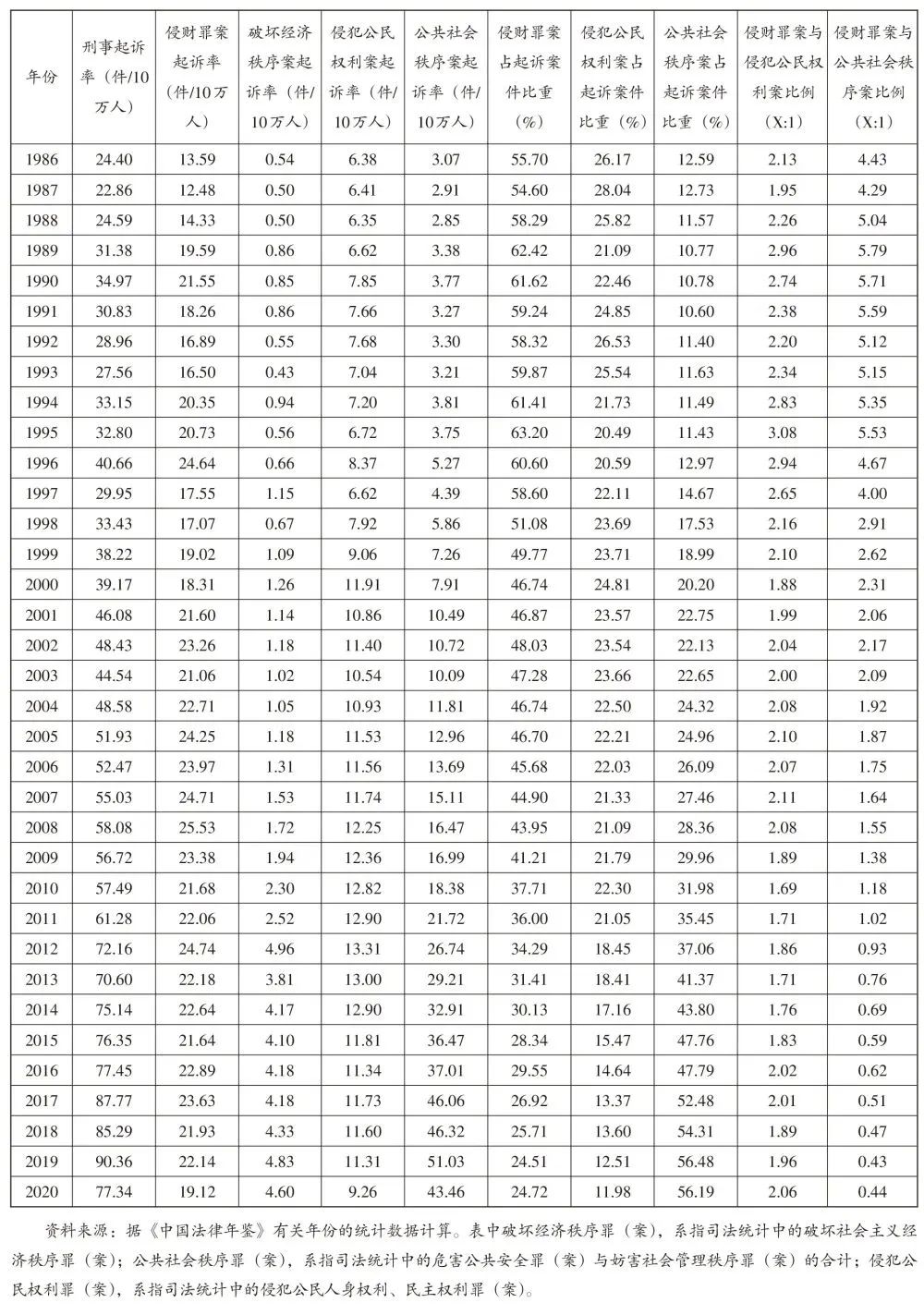 犯罪的结构相对指标与比例相对指标的统计数据同样表明,近年来随着社会转型的日益深入,刑事犯罪内部结构呈现出危害公共社会秩序罪案日益突出的态势,也即侵财犯罪以及侵犯公民个人犯罪所占比重逐步缩小,而针对公共安全和社会秩序的犯罪所占比重则日渐增大。